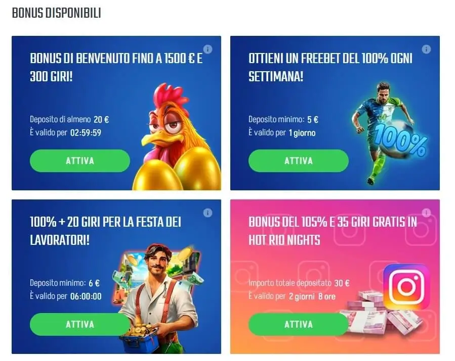 Una volta completata la registrazione e il deposito, avrai diritto ai bonus e promozioni attive sul sito, inclusi giri gratis e credito extra. - Navigazione intuitiva e sicura.