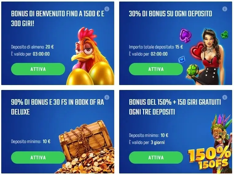- Fra le promozioni speciali, si annunziano in esclusiva a vio d’alcun popolare avvenimento, feste, anniversarî, programmi addizionali di bonus, giri gratis e altro.